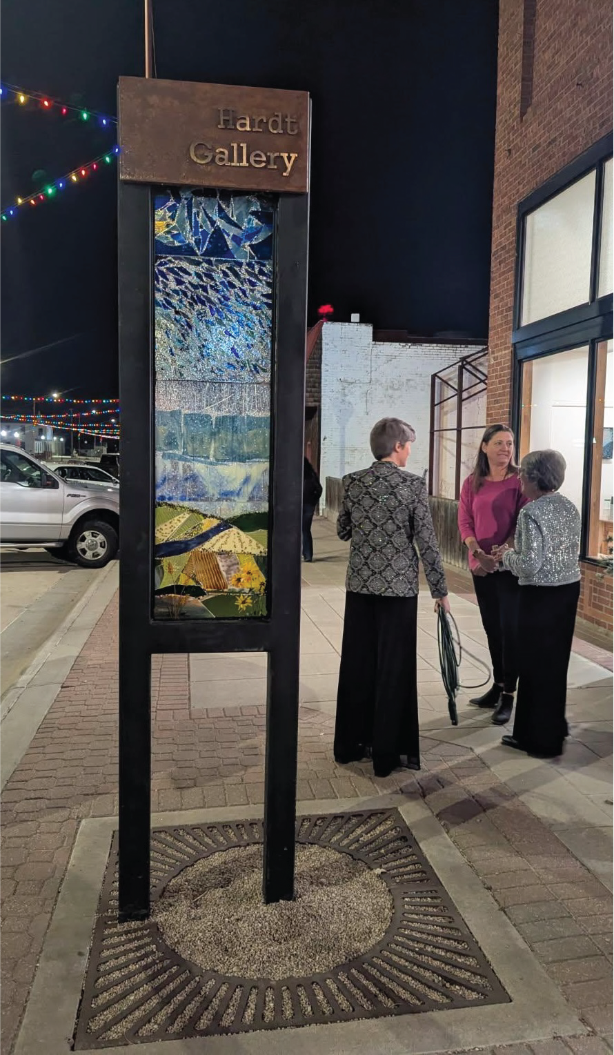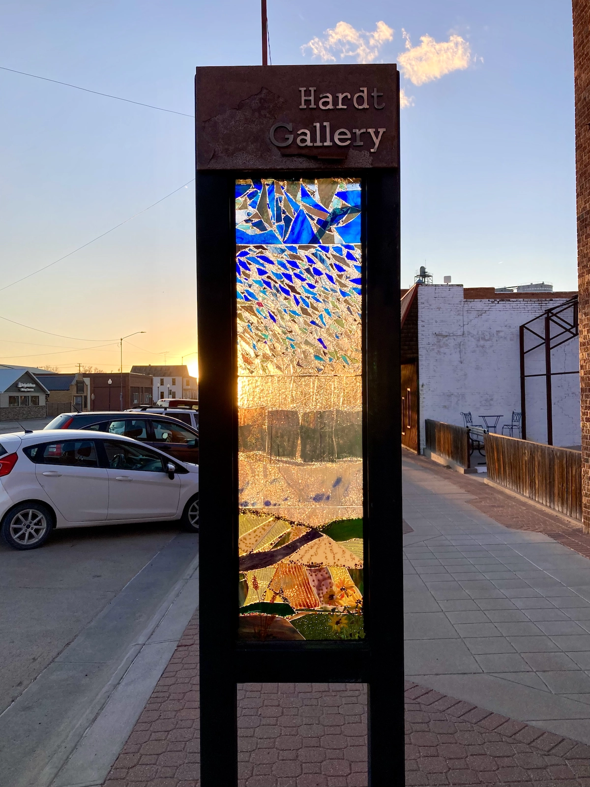 Newest addition to 202 is a new custom Hardt Gallery marker featuring a fused glass piece of the Northwest Kansas horizon by Kim Zweygardt.